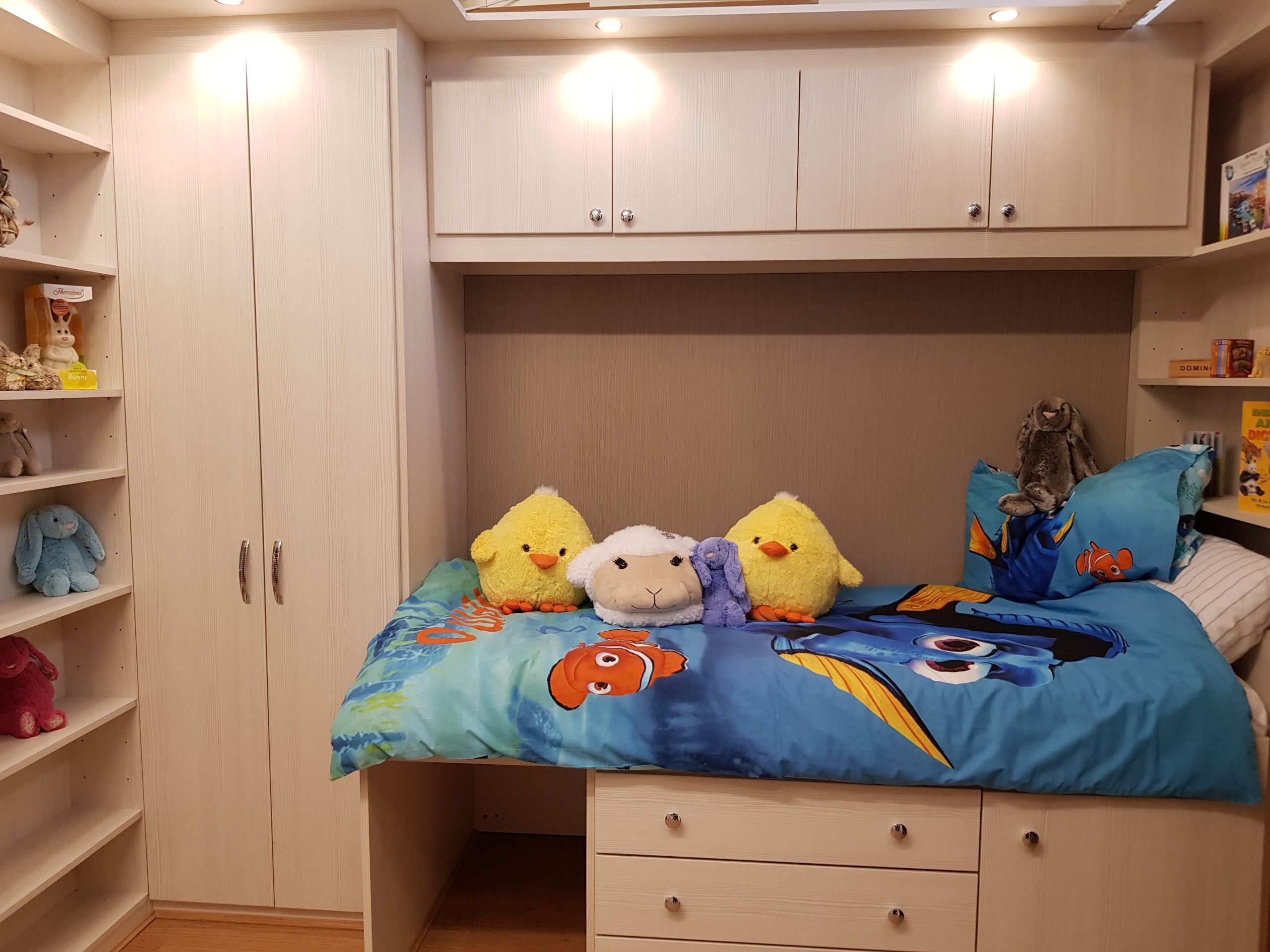 We have a lovely range of children’s bedroom furniture which includes a versatile cabin bed, a wardrobe, top cupboards, a chest of drawers beside a cupboard underneath and shelving at each end. All fitted to your child’s bedroom. Please call for details.